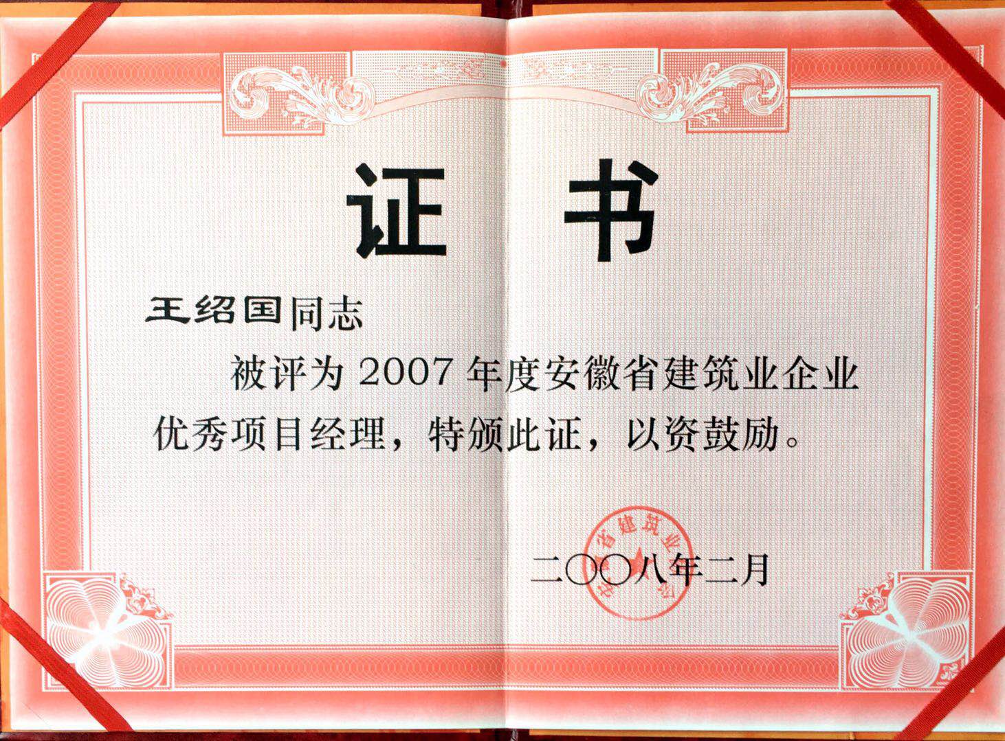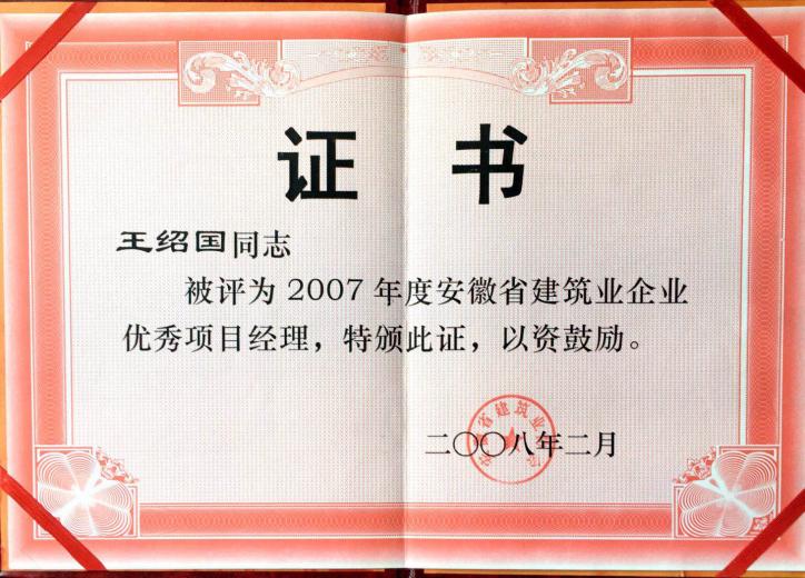 2007年度安徽省建筑业优秀项目经理王绍国
