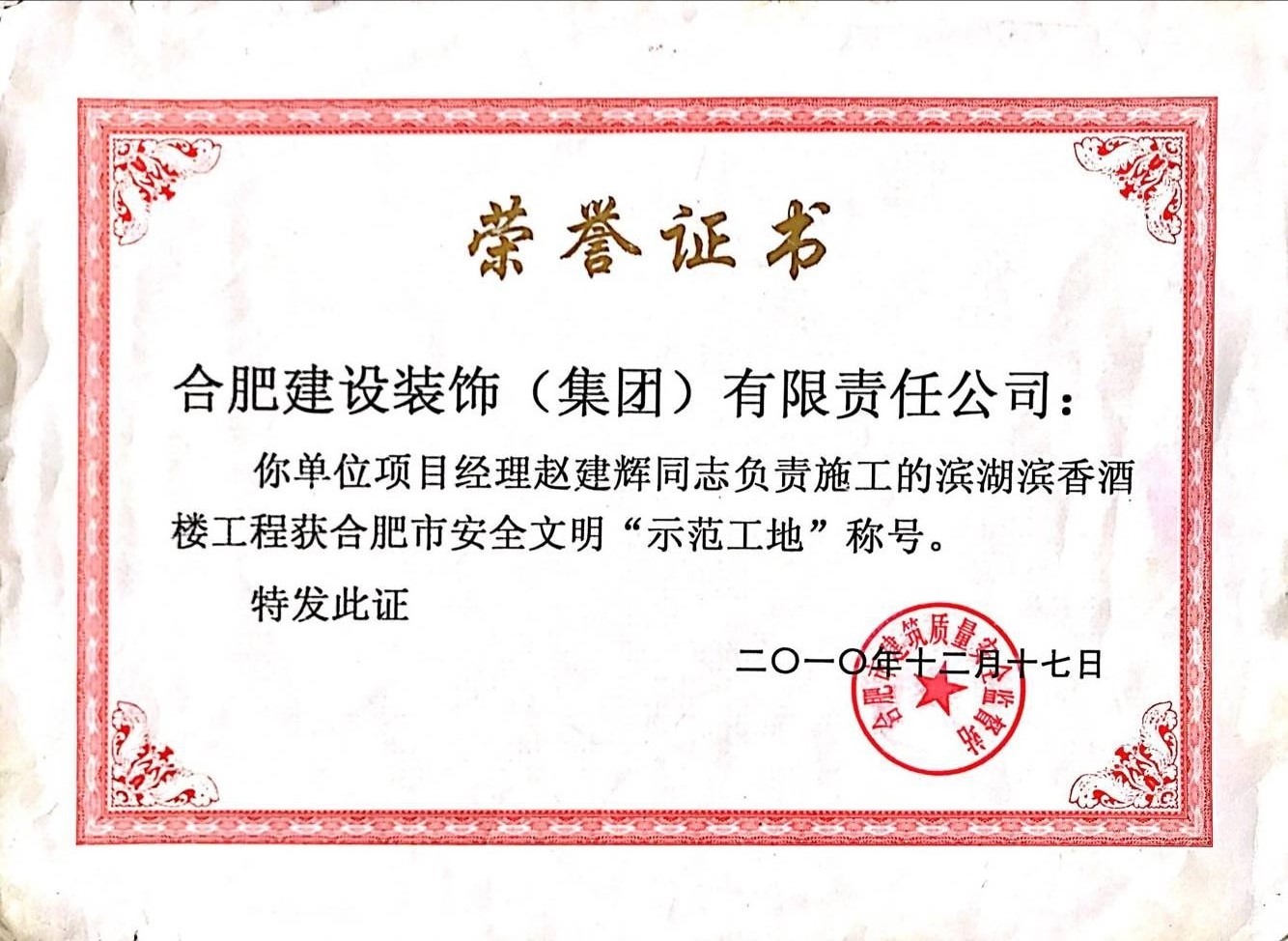>2010年合肥市安全文明示范工地--滨湖滨香酒楼工程
