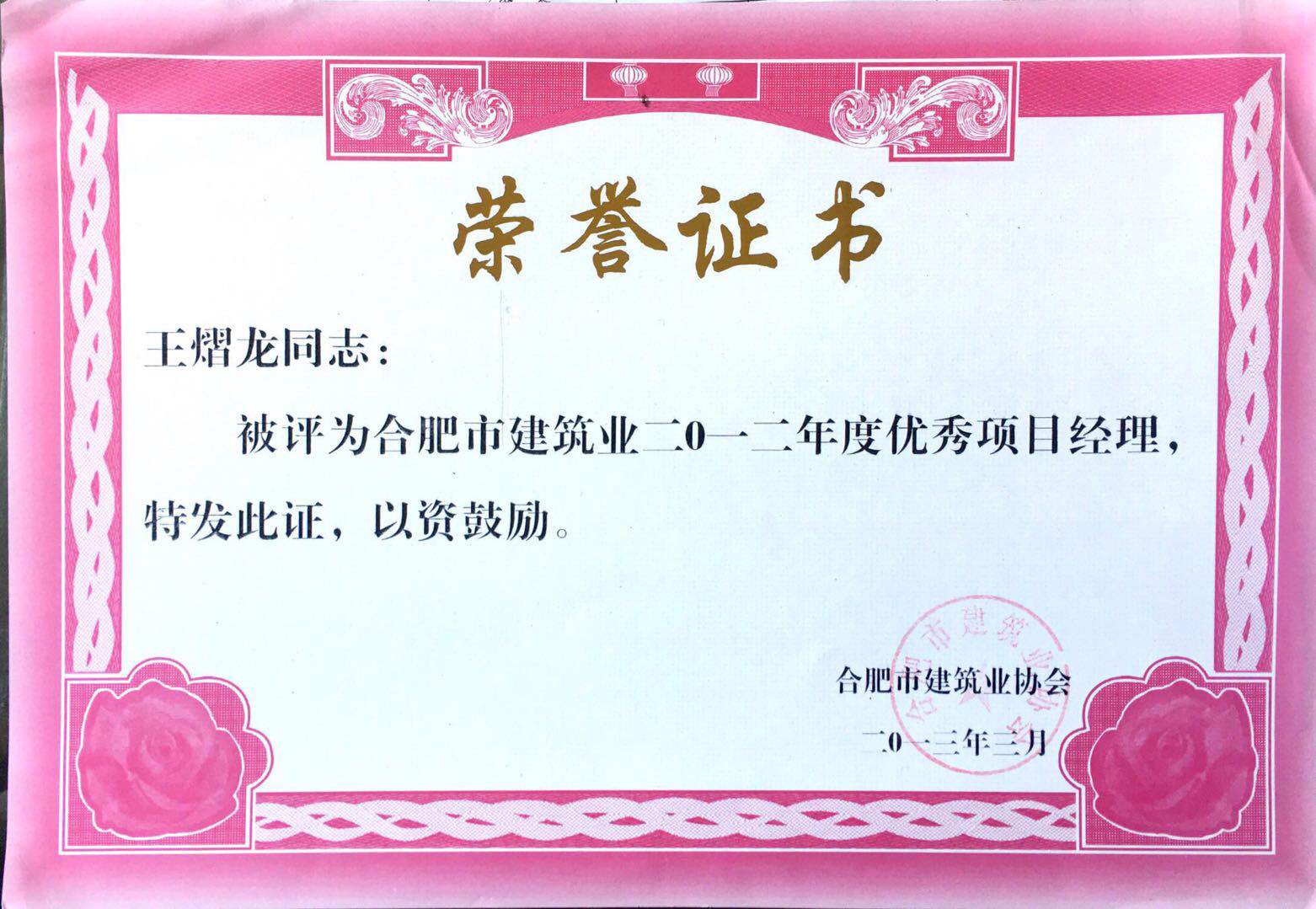 >2012年度优秀项目经理王熠龙