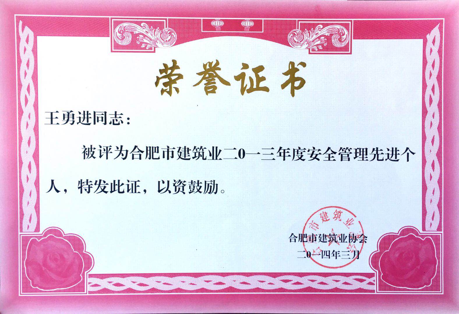 >2013年度安全管理先进个人王勇进