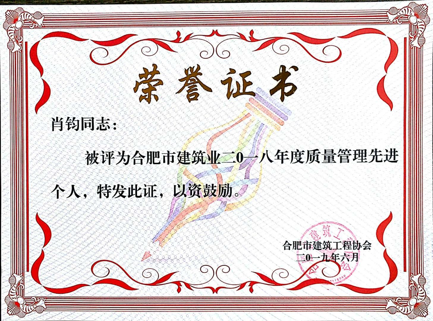>2019年肖钧质量管理先进个人