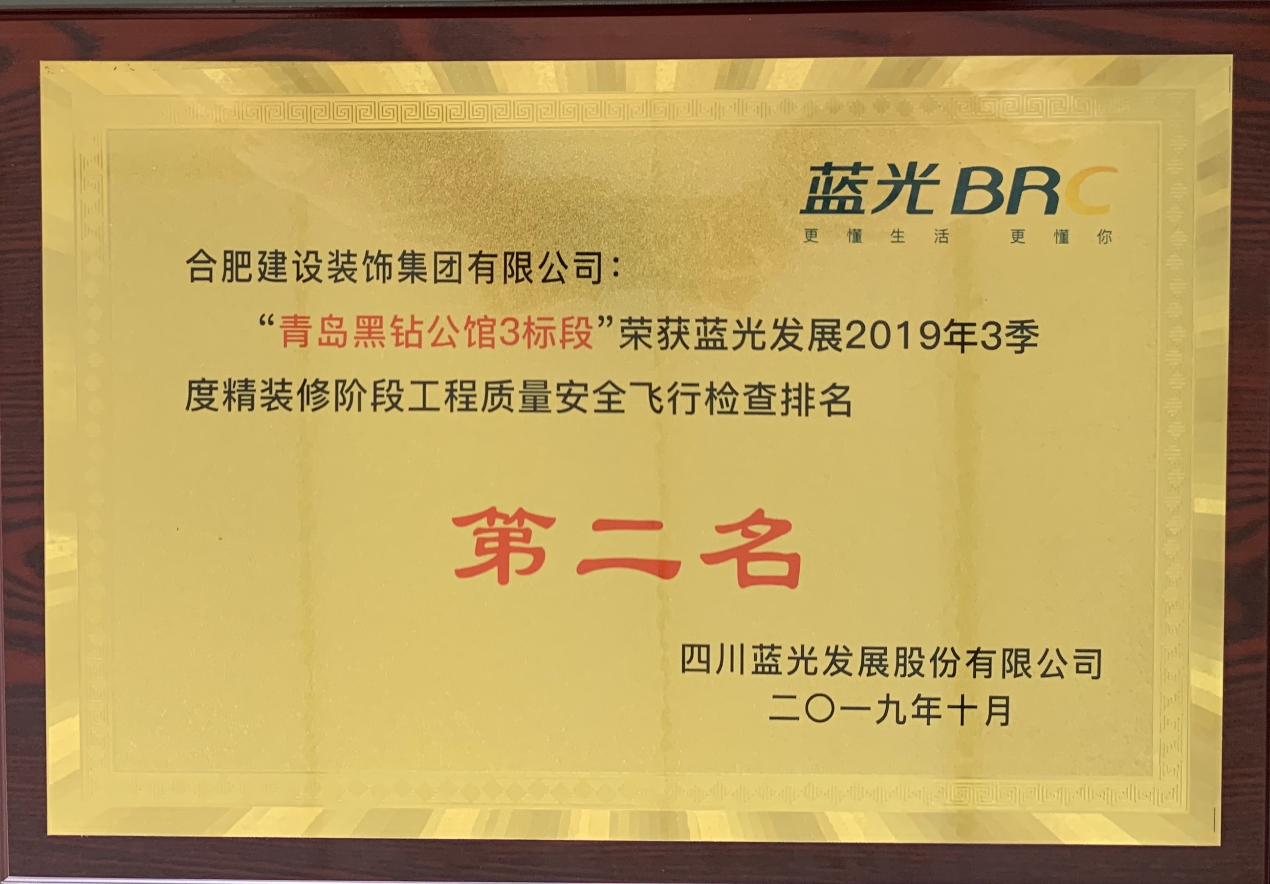 >青岛黑钻公馆3标段荣获蓝光发展2019年3季度精装修阶段工程质量安全飞行检查排名第二名