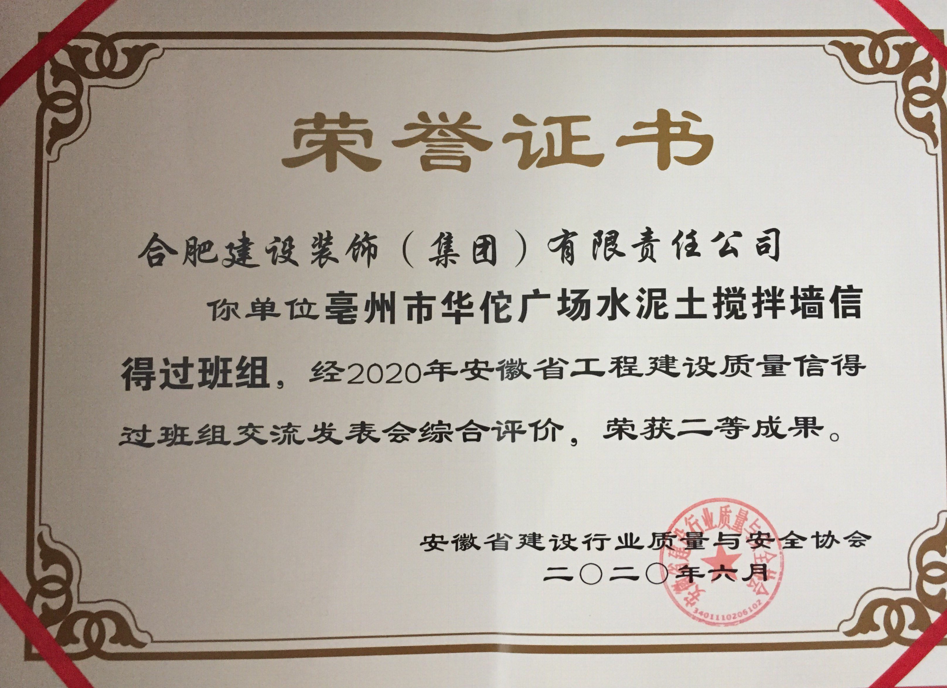 >亳州华佗广场基础工程QC小组《提高水泥土搅拌墙成墙质量验收合格率》成果荣获2020年安徽省工程建设质量管理小组成果一等奖
