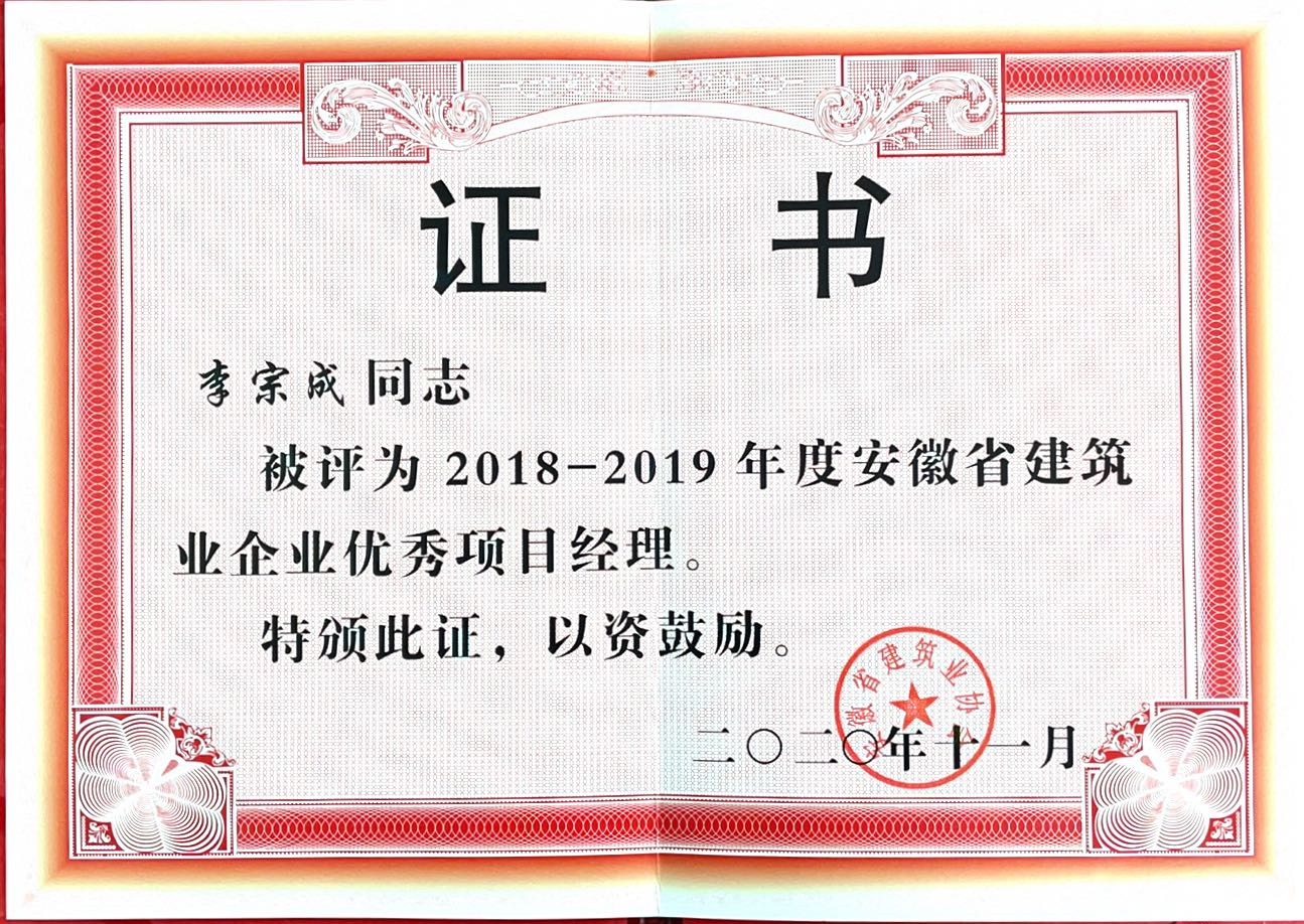 >2020年安徽省建筑业企业优秀项目经理--李宗成