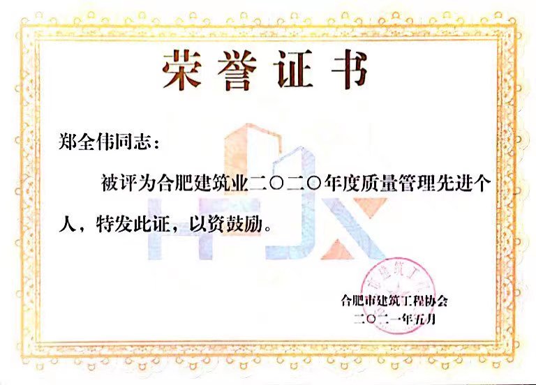 2020年度合肥建筑业质量管理先进个人——郑全伟
