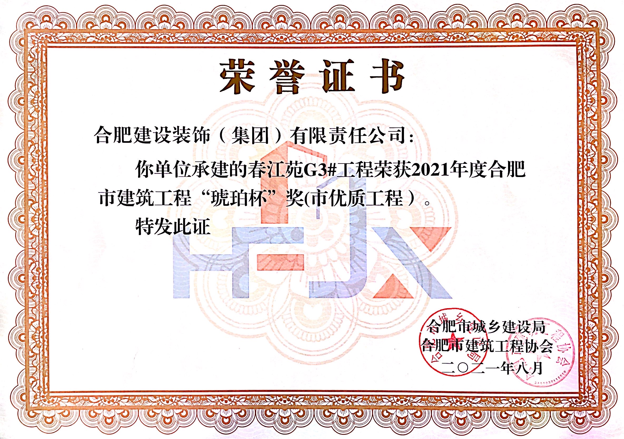 >春江苑G3#--2021年度合肥市建筑工程“琥珀杯”奖(市优质工程)